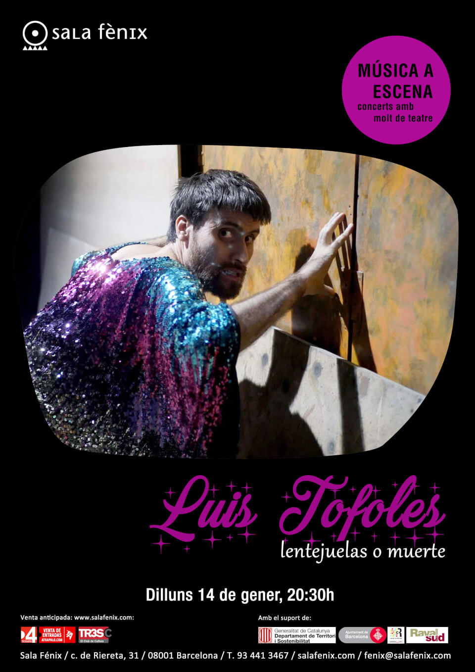 Luis Tofoles presenta su espectáculo performatico musical, titulado “Lentejuelas o muerte”, con canciones de su autoria de diferentes epocas artisticas, dilucidando su capacidad de dibujar emociones diversas y sus contradicciones humanas y artisticas. Ni anarquico ni nihilista desnuda el absurdo de estar en el presente con humor y extravagancias que es el nucleo fundamental de su espectaculo.
